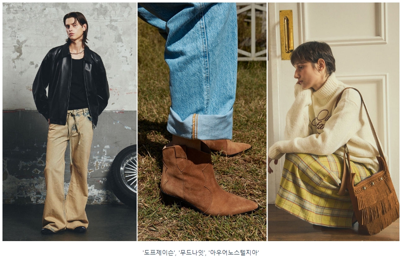 무신사에 따르면, 지난달 17일부터 이달 16일까지 ’스웨이드 자켓’, ‘가죽자켓’ 검색량은 전년 동기 대비 각각 65%, 70% 늘었다. 무신사 인기 아우터 랭킹에도 스웨이드·가죽 재킷이 상위에 올랐다. 10위 권에 캐주얼 ‘스탠다드에러’의 스탠다드 블루종 스웨이드 재킷, 가죽 전문 ‘도프제이슨’의 오버핏 비건레더 싱글 재킷이 이름을 올렸다. 29CM은 이달 4일부터 17일까지 무스탕의 거래액이 3배 이상 증가했다고 밝혔다. 무스탕 키워드 검색량도 10월 둘째 주 기준 전월 동기 대비 270% 상승했다.