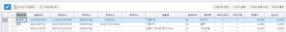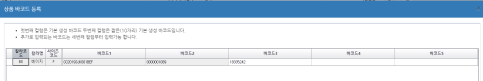 상품코드+컬러+사이즈 순으로 바코드1번이 자동생성이 되며,