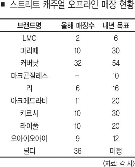 온라인 태생의 1세대 스트리트 캐주얼은 물론 신규 캐주얼 브랜드까지 오프라인 출점에 적극 나서고 있다. 하반기 들어 상반기에 잡은 목표 매장 수보다 20% 이상 상향 조정하는 분위기다. 내년 목표는 대부분 두 배 이상 이다.