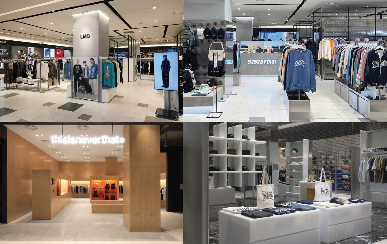 (위)'LMC'와 ‘5252 BY O!Oi’ 신세계 강남점 매장, (아래)‘마리떼 프랑소와 저버(MFG)’, ‘칸코’, ‘디스이즈네버댓’ 더현대 서울 매장