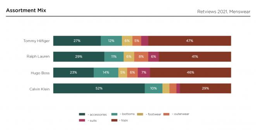 렛뷰 데이터에 따르면 속옷을 포함해 액세서리에 더 중점을 두고 있는 캘빈 클라인을 제외한 프리미엄 남성복들은 모두 상의 비중이 40% 이상을 차지하고 있다. 상의 중에서도 티셔츠가 가장 눈에 띄는 아이템으로, 폴로와 스웨트셔츠가 그 뒤를 잇고 있어 캐주얼웨어의 인기가 여전함을 확인할 수 있다.