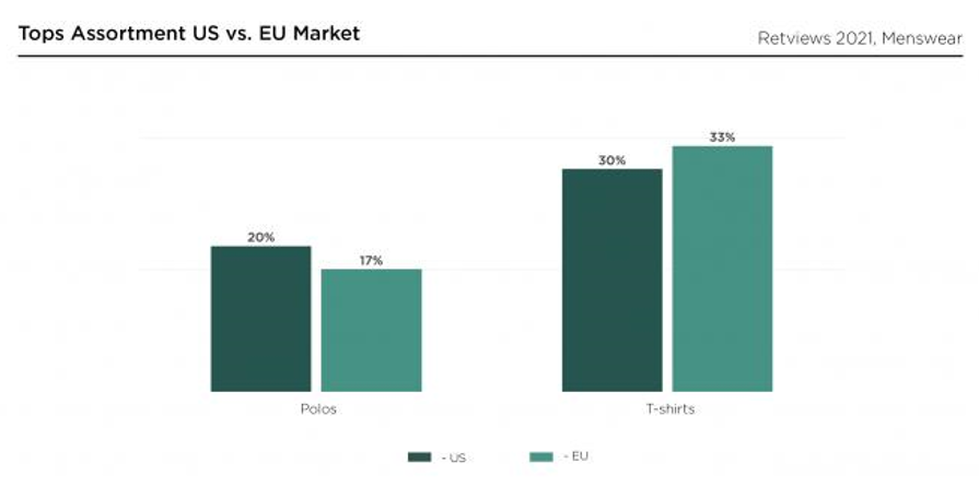 렛뷰 데이터에 따르면 티셔츠는 두 시장에서 가장 인기 있는 상의 아이템이지만, 미국 제품보다 프리미엄 브랜드의 유럽 제품이 더 강세를 보이고 있다. 반면 폴로 셔츠는 미국 시장에서 그 비중이 더 높은데, 이는 미국 내 남성복이 밀레니얼스와 Z세대를 타게팅하고 있음을 나타낸다.