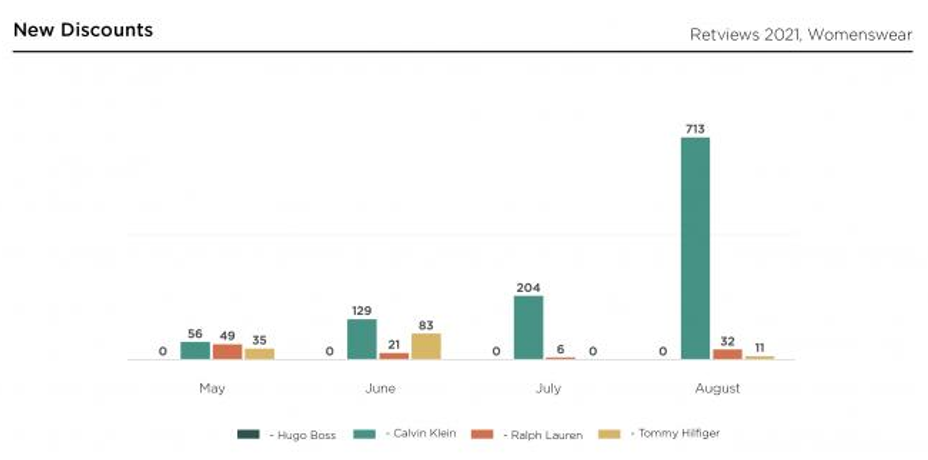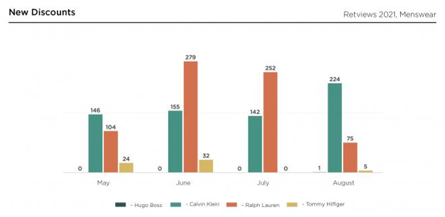 대표적인 남성 프리미엄 브랜드인 캘빈 클라인과 랄프 로렌은 여름 시즌 내내 안정적인 물량의 할인 상품을 선보였고, 가을 시즌에는 할인 폭을 최소한으로 제한하는 모습이다. 같은 기간 할인율이 낮았던 여성복과 여름이 끝나갈 무렵 캘빈 클라인의 여성복이 큰 폭 할인을 시작한 것과 확연한 차이가 있다.