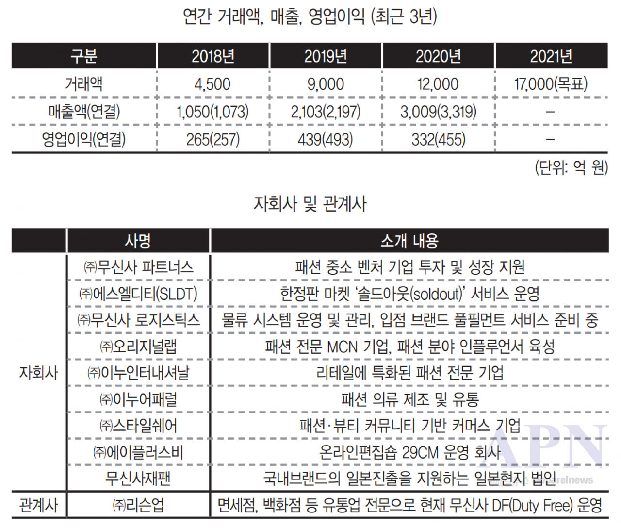 지난해 매출은 3009억원, 영업이익 332억원을 기록했고, 최근 6년간 연평균 매출 성장률이 55.7%에 달한다. 다른 온라인 유통 플랫폼들이 적자를 면치 못한데 반해 무신사는 흑자 기조를 이어오고 있다.