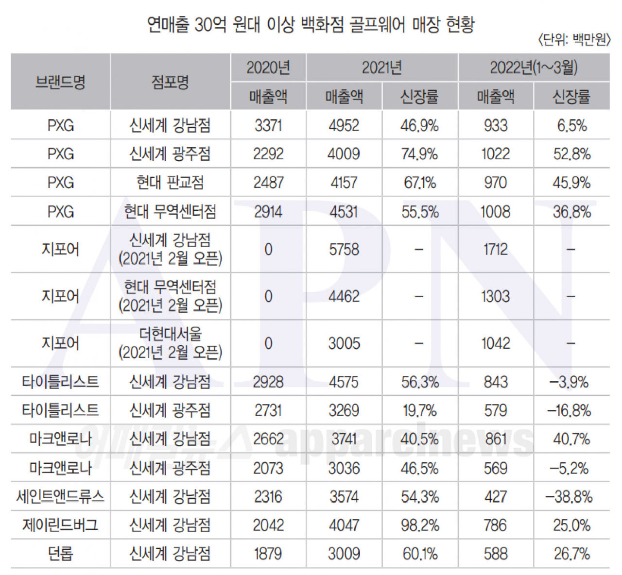 지난해 주요 백화점 점포 내 골프웨어들의 매출 실적을 살펴본 결과, 2020년에는 ‘PXG’ 신세계 강남점이 유일했으나, 지난해에는 다수의 브랜드 매장이 여러 점포에서 30억 원 이상의 매출을 기록했다.