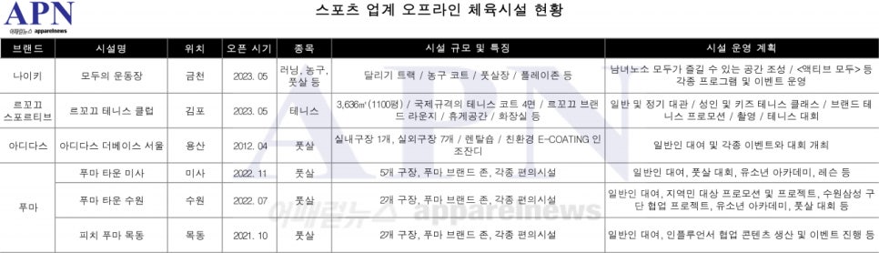 [어패럴뉴스 오경천 기자] 최근 1~2년 사이 스포츠 브랜드들이 오프라인 체육시설을 확대하고 있다.