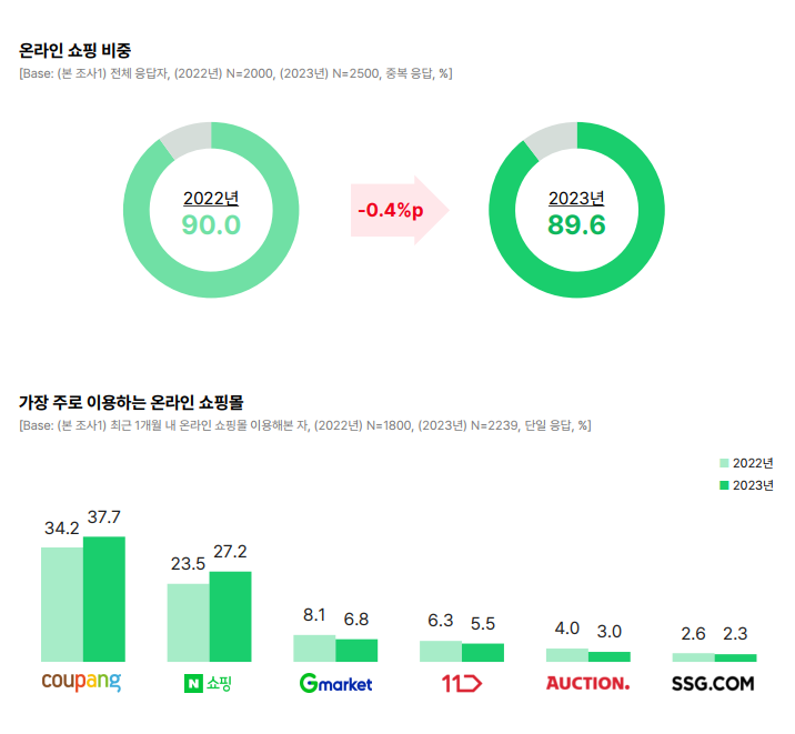 반면 지마켓, 11번가, 옥션, SSG닷컴 등 오픈마켓과 종합몰 이용은 감소세다. ‘지마켓’은 6.8%로 1.3%P 줄었고, ‘11번가’는 5.5%로 0.8%P 줄었다. ‘옥션’과 ‘SSG닷컴’도 각각 3%, 2.3%로 전년보다 1%P, 0.3%P씩 감소했다.