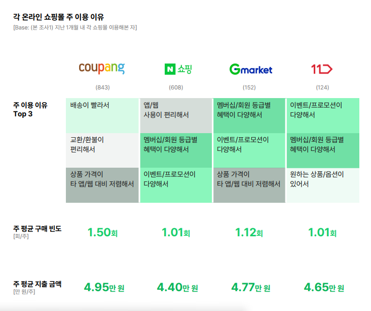 주 평균 지출 금액도 ‘쿠팡’ 4.95만 원, ‘지마켓’ 4.77만 원, ‘11번가’ 4.65만 원, ‘네이버쇼핑’ 4.4만 원 순으로 ‘쿠팡’이 가장 높았다.