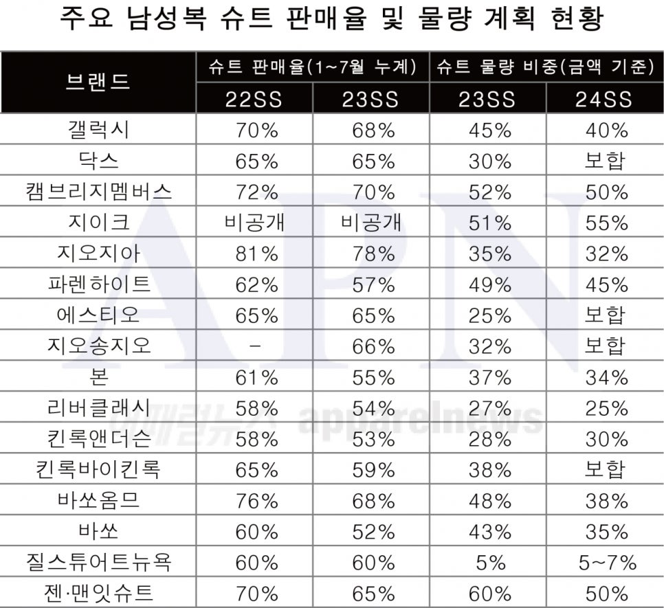 업계에 따르면, 올 춘하 시즌(1~7월 누계) 슈트 판매율은 전년 동기 대비 대부분 하락했다. 최소 보합에서 최대 8%p 줄었다.