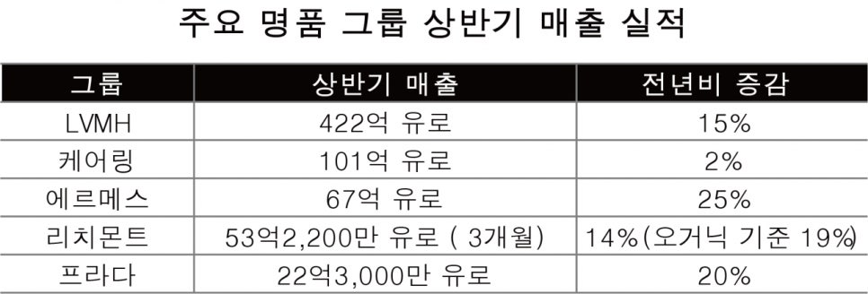 그러나 개별 그룹의 상반기 6개월 실적을 놓고 보면 지난해 같은 기간에 비해 LVMH 15%, 에르메스 25%, 프라다 20%, 몽클레르 24%, 제냐 23.9%의 매출 성장을 누렸다.