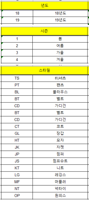 이와같이 년도 시즌 스타일까지 세부코드들 예시를 보여드릴게요