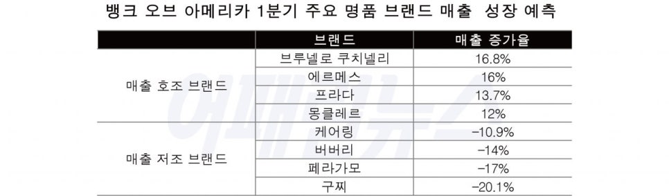 보고서에 따르면 지난해 동기와 비교한 1분기 매출 증가율은 브루넬로 쿠치넬리 16.8%, 에르메스 16%, 프라다 13.7%, 몽클레르 12% 등으로 좋았으나, 케어링 –10.9%, 버버리 –14%, 페라가모 –17%, 구찌 –20.1% 등의 저조한 브랜드로 분류됐다.