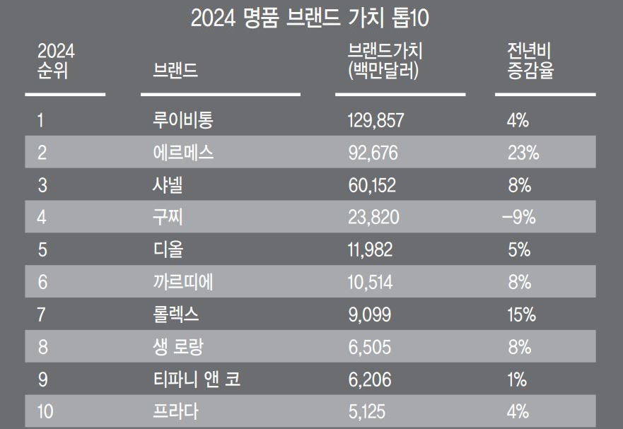 루이비통이 지난해 글로벌 100대 브랜드 가운데 8위에 등극, 명품 브랜드 가치를 한껏 뽐냈지만 올해는 4% 성장, 1,298억5,700만 달러의 가치로 12위, 10위권 밖으로 밀렸다.
