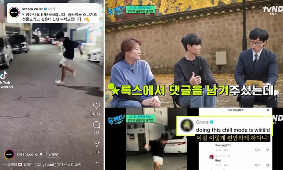 네이버의 한정판 플랫폼 크림은 ‘슬릭백용 스니커즈를 선물 해주고 싶다’는 댓글을 남기며, 리셀가 190만 원 상당의 나이키×트래비스스캇 신발을 선물했다.