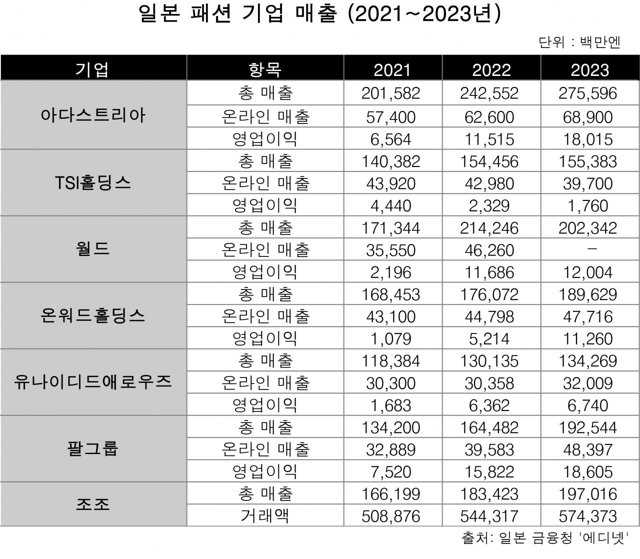 연간 100조 원대로 추정됐던 일본 패션 시장 규모는 코로나 타격으로 2020년 약 30%가 축소됐는데, 매출 하락을 방어하기 위해 온라인 영업을 강화했던 주요 패션 기업들의 회복세가 더 빠르게 나타났다.