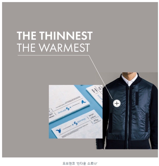 이탈리아 니피사 씬다운의 국내 공급 업체인 오쏘앤코는 동물과 식물 다운을 결합한 ‘씬다운 소로나(THINDOWN SORONA)’의 영업을 한층 강화 중이다. '씬다운'을 개발한 니피 사와 ‘소로나’의 미국 듀폰사가 공동 개발한 제품이다. 동물성 다운에 식물 기반의 옥수수 성분을 입힌 고성능 섬유 '소로나'를 혼합한 제품이다.