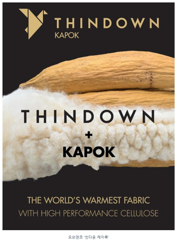 이 회사는 올해 ‘씬다운 케이폭’도 도입했다. ‘식물성 양모’로 불리는 케이폭은 아프리카와 중앙아메리카에서 자라는 세이바 나무 열매를 추출해 만든 천연 식물성 다운이다. 80%의 공기를 함유, 부드럽고 가벼우면서도 보온이 탁월하다.