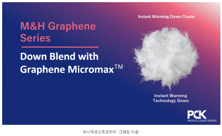 PCK(퍼시픽코스트코리아)도 신개념 대체 다운으로 신소재인 ‘그래핀’과 ‘다운’을 결합한 그래핀 다운(GRAPHENE DOWN)의 영업을 강화하고 있다.