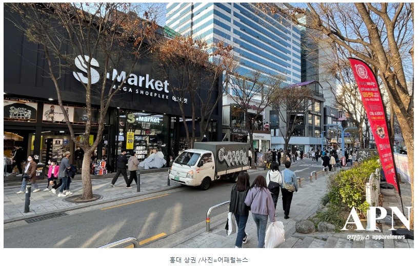 공실은 줄었지만 양극화는 심화되고 있다. 지난 3분기 홍대 상권 공실률은 전년 15.9%에서 12.2%로 낮아졌다. 홍익로 패션 메인거리, 서교동 골목은 매장들이 빼곡히 차 있는데 반해, 홍대 정문 내리막길과 놀이터 부근 근처에 공실이 몰려있다.