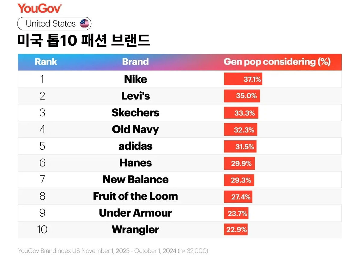 이같은 내용은 영국에 본사를 둔 글로벌 리서치 데이터 및 분석 기업 유고브(YouGov)의 올해 미국인들이 가장 좋아하는 패션 브랜드 조사 결과다.