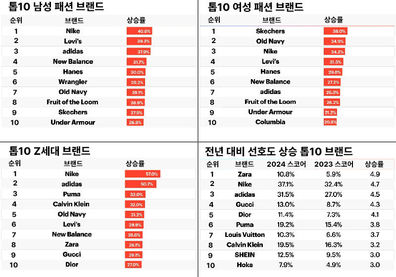 구찌, 디올, 루이비통 등 명품 브랜드들도 지난해 한자리에서 두 자릿수로 올라갔고, 중국 온라인 패션 쉬인이 지난해 9.5%에서 올해는 12.5%로 3.0% 포인트, 인기 상승의 스니커즈 브랜드 호카도 지난해 4.9%에서 7.9%로 3.0% 포인트 올라갔다.