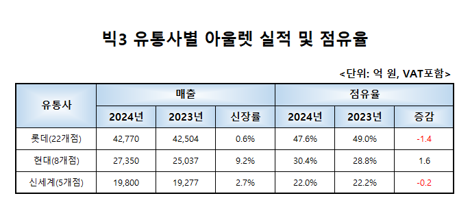 유통사별 실적을 살펴보면, 롯데(22개 점포)는 4조2,770억 원의 매출로 0.6%의 신장률을 기록했다. 점유율은 47.6%로 전년보다 1.4%p 감소했다.