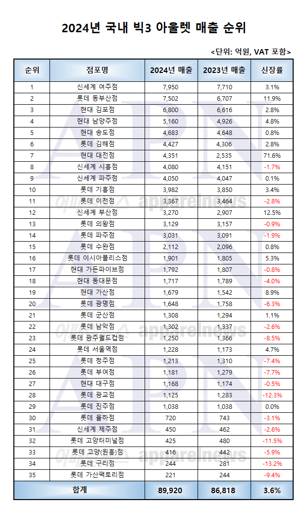 2024년 국내 3대 아울렛 35개 점포 매출 순위