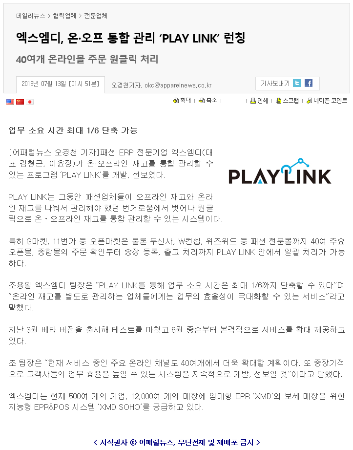 어패럴뉴스 - 'PLAY LINK' 런칭_온·오프 통합관리