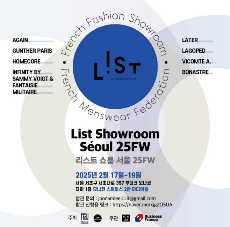 [어패럴뉴스 박해영 기자] 프랑스 패션 협회와 주한 프랑스 대사관이 공동 주최하는 프랑스 패션 트레이드쇼 ‘리스트 쇼룸 서울(List Showroom Seoul)’이 오는 17일부터 19일까지 3일 동안 강남역 모나코 스페이스에서 열린다.