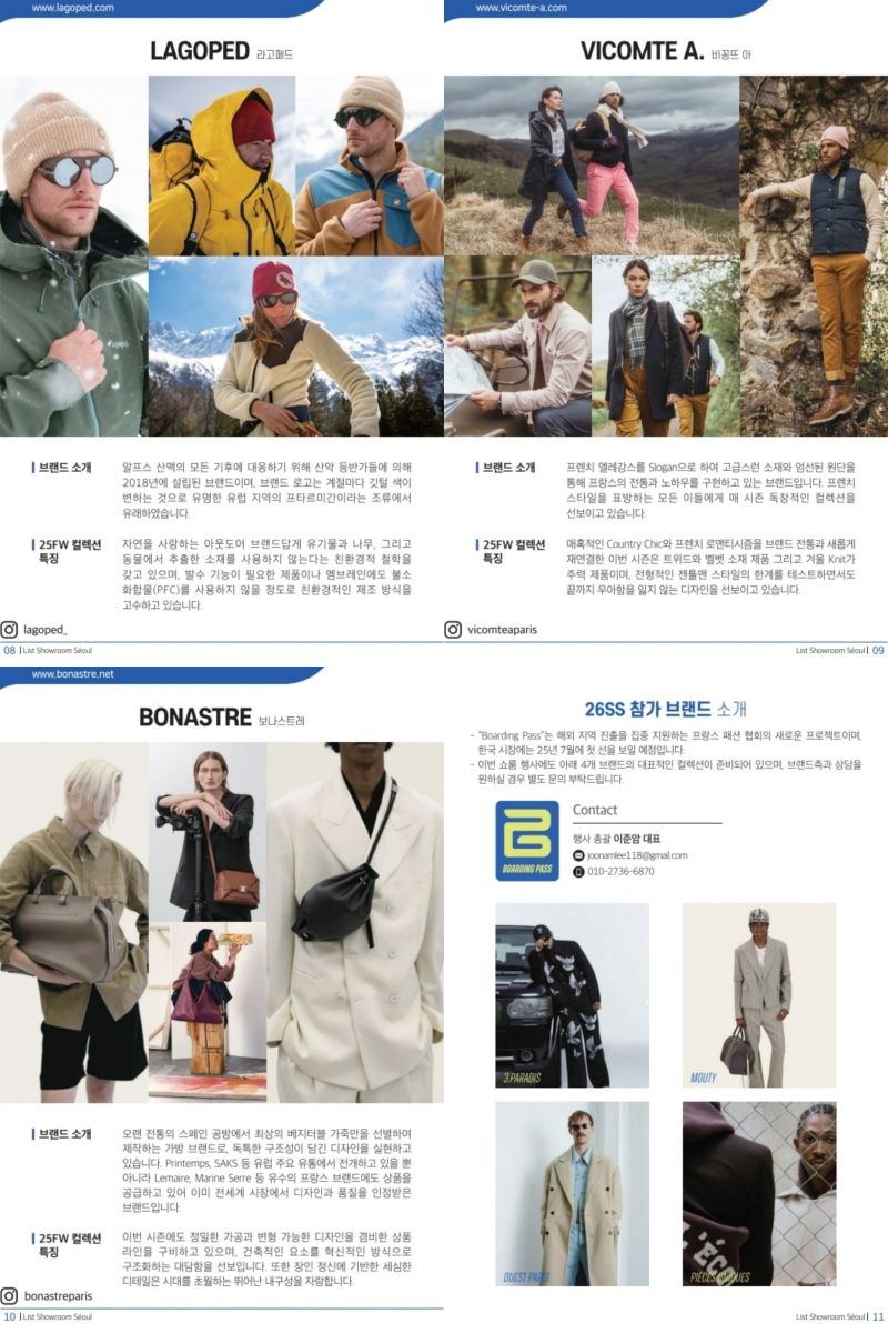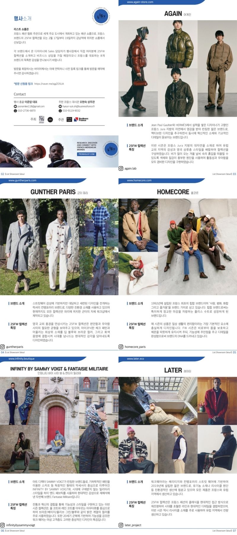 참가 브랜드는 어게인(AGAIN), 군터파리(GUNTHER PARIS), 홈코르(HOMECORE), 레이터(LATER) 등 총 8개 브랜드다. 컨템포러리, 스트리트 캐주얼, 워크웨어, 가방 등 다양한 카테고리에서 국내 경쟁력이 있다고 판단되는 대표 브랜드 위주로 선정했다. 전반적으로 지속가능 테마에 프렌치 감성이 짙은 브랜드 비중이 높다.