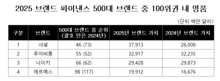 한편 브랜드 파이낸스의 2025년 세계 500대 브랜드 가치 조사에서는 세계 500대 브랜드 가운데 명품과 패션 브랜드는 15개 (뷰티의 루레알 포함), 100대 브랜드에는 샤넬, 루이비통, 나이키, 에르메스 등 4개 브랜드가 포함됐다.