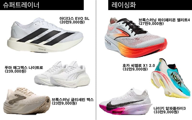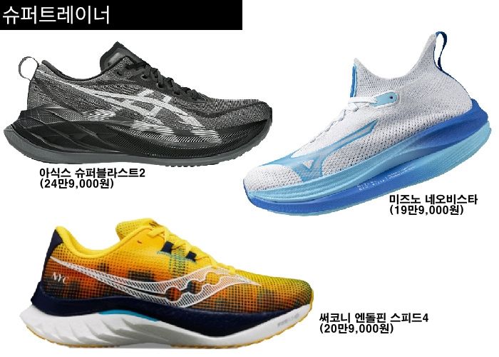 올해 시장에 판매되는 슈퍼트레이너 제품으로는 아디다스 EVO SL(20만9,000원), 아식스 슈퍼블라스트2(24만9,000원), 뉴발란스 SC 트레이너(24만9,000원), 푸마 매그맥스(20만9,000원), 브룩스러닝 글리세린 맥스(23만9,000원), 하이페리온 맥스2(21만9,000원), 미즈노 네오비스타(19만9,000원), 호카 스카이워드X(27만9,000원), 써코니 엔돌핀 스피드4(20만9,000원) 등이 있다. 최소 20만 초반, 최대 27만 원대에 형성돼 있다.
