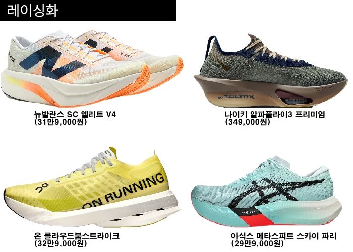 현재 레이싱화는 카본 등 고기능성이 추가되면서 대부분 30만 원대가 중심가로 형성돼 있다. 서코니 엔들핀 엘리트2(33만9,000원), 나이키 알파플라이3(33만9,000원), 브룩스러닝 하이페리온 엘리트4(27만9,000원), 호카 씨엘로 X1 2.0(32만9,000원), 온 클라우드붐스트라이크(32만9,000원), 아식스 메타스피트 스카이 파리(29만9,000원), 뉴발란스 SC 엘리트 V4(31만9,000원), 미즈노 웨이프 리벨리온 프로3(25만9,000원) 등이다.