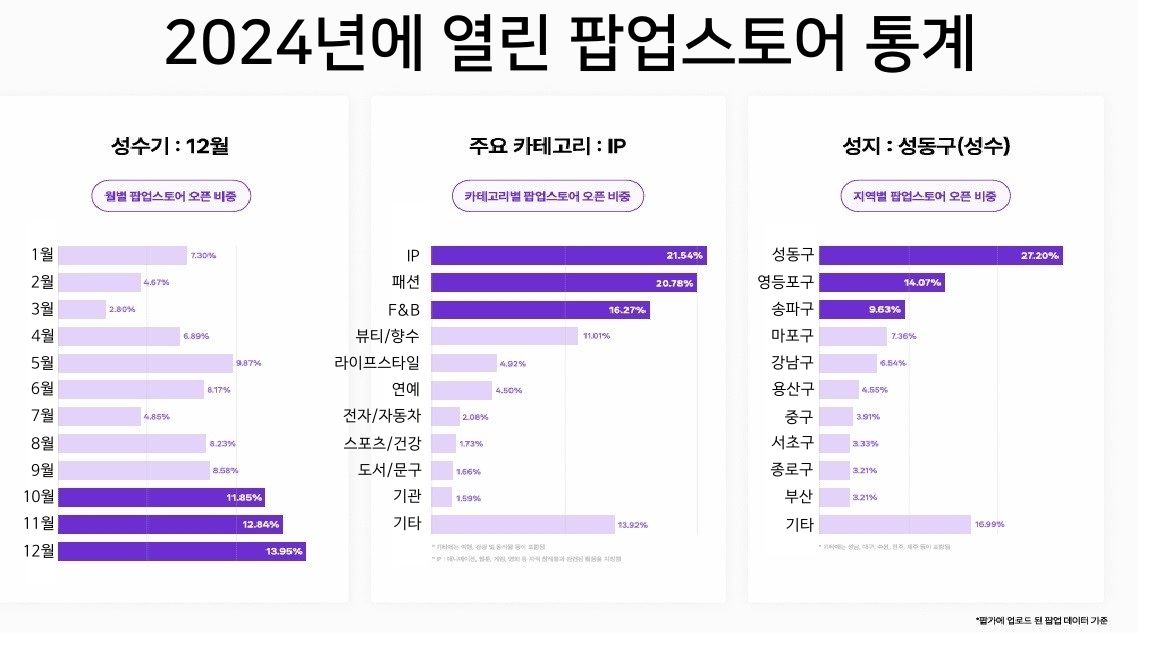 연중 팝업 스토어 오픈이 가장 활발한 시기는 10월 11.85%, 11월 12.84%, 12월이 13.95%로 가장 높았다. 반면 가장 드문 시기는 2월, 3월, 7월로 각각 4.67%, 2.80%, 4.85%로 조사됐다. 나머지 평월 기준으로 약 7~8%를 기록했다.