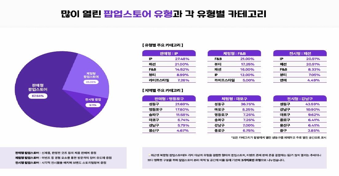 지역별 데이터를 조사한 결과 성수동이 위치한 성동구가 27.20%로 압도적으로 높았고, 더현대 서울이 위치한 영등포구가 14.07%, 롯데 잠실점이 위치한 송파구가 9.63%로 높았다. 뒤를 이어 마포구(홍대), 강남구(도산, 강남 등), 용산구(이태원, 한남) 순으로 나타났다. 특히 더현대 서울은 지난 한 해 동안 360회 이상의 팝업 스토어를 운영한 것으로 조사됐다.