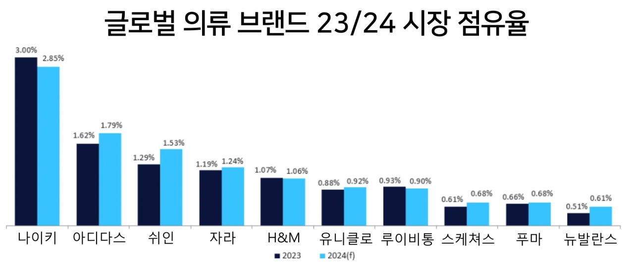 영국에 본사를 둔 데이터 분석 및 컨설팅 회사 글로벌 데이터에 따르면 지난해 글로벌 의류 시장 점유율이 가장 높았던 의류 브랜드는 점유율 2.85%의 나이키, 2위는 1.79%의 아디다스, 3위는 중국 쉬인의 1.53%로 조사됐다. 4위 자라, 5위 H&M, 6위 유니클로, 7위 루이비통 순이다.