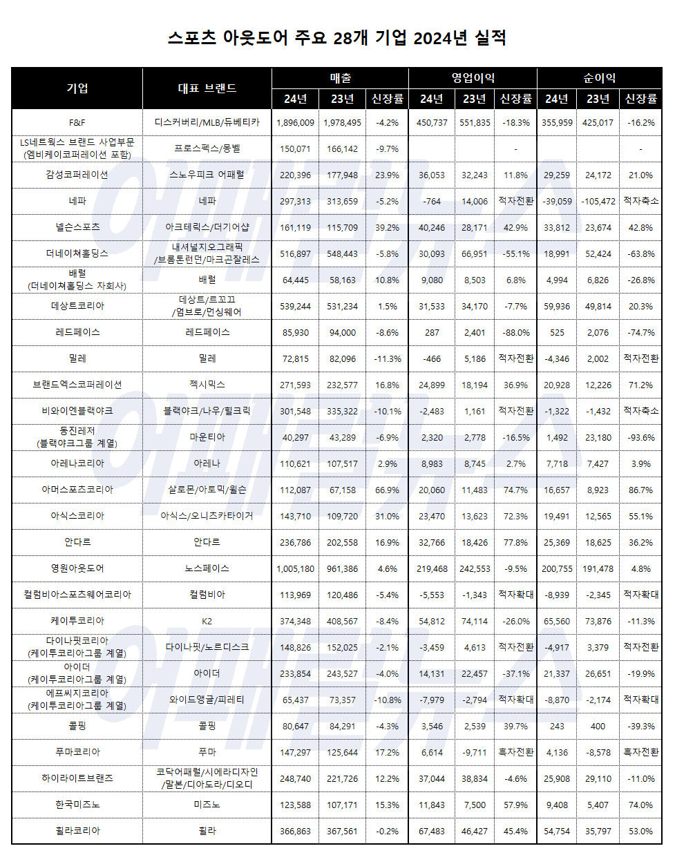 [어패럴뉴스 오경천 기자] 스포츠ㆍ아웃도어 브랜드 사업을 전문으로 하는 기업들의 지난해 매출 실적은 비교적 안정세를 나타냈다. 전년과 비교해 한 자릿수 소폭 성장에 불과하지만, 2021년부터 4년 연속 꾸준한 성장세를 기록하고 있다는 점이 주목된다.