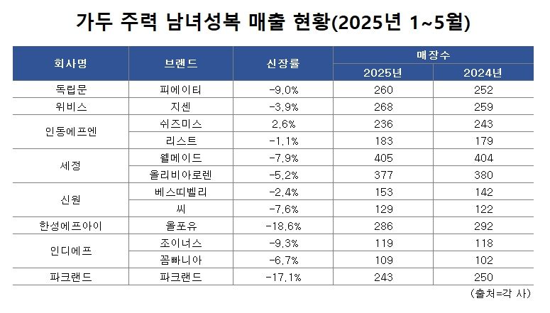 업계에 따르면, 주요 12개 브랜드의 올해 5월 누계 매출은 지난해 동기 대비 –8.6%를 기록했다. 매장은 평균 231개로 지난해보다 유통망이 2개 늘어났음에도 역신장했다. 인동에프엔의 ‘쉬즈미스’만 소폭(2.6%) 신장했다.
