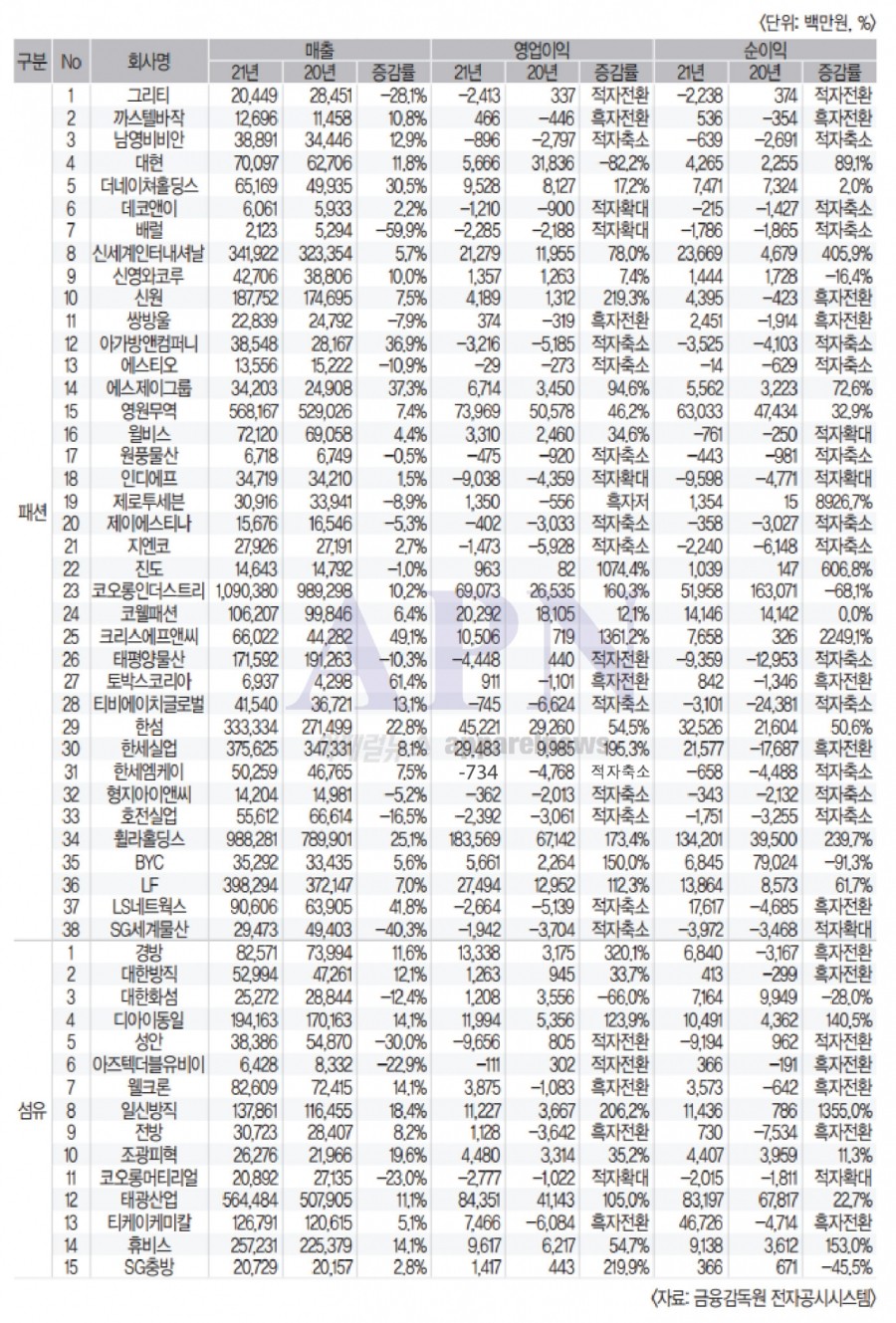 섬유도 매출·영업이익 신장...적자는 4곳 보합