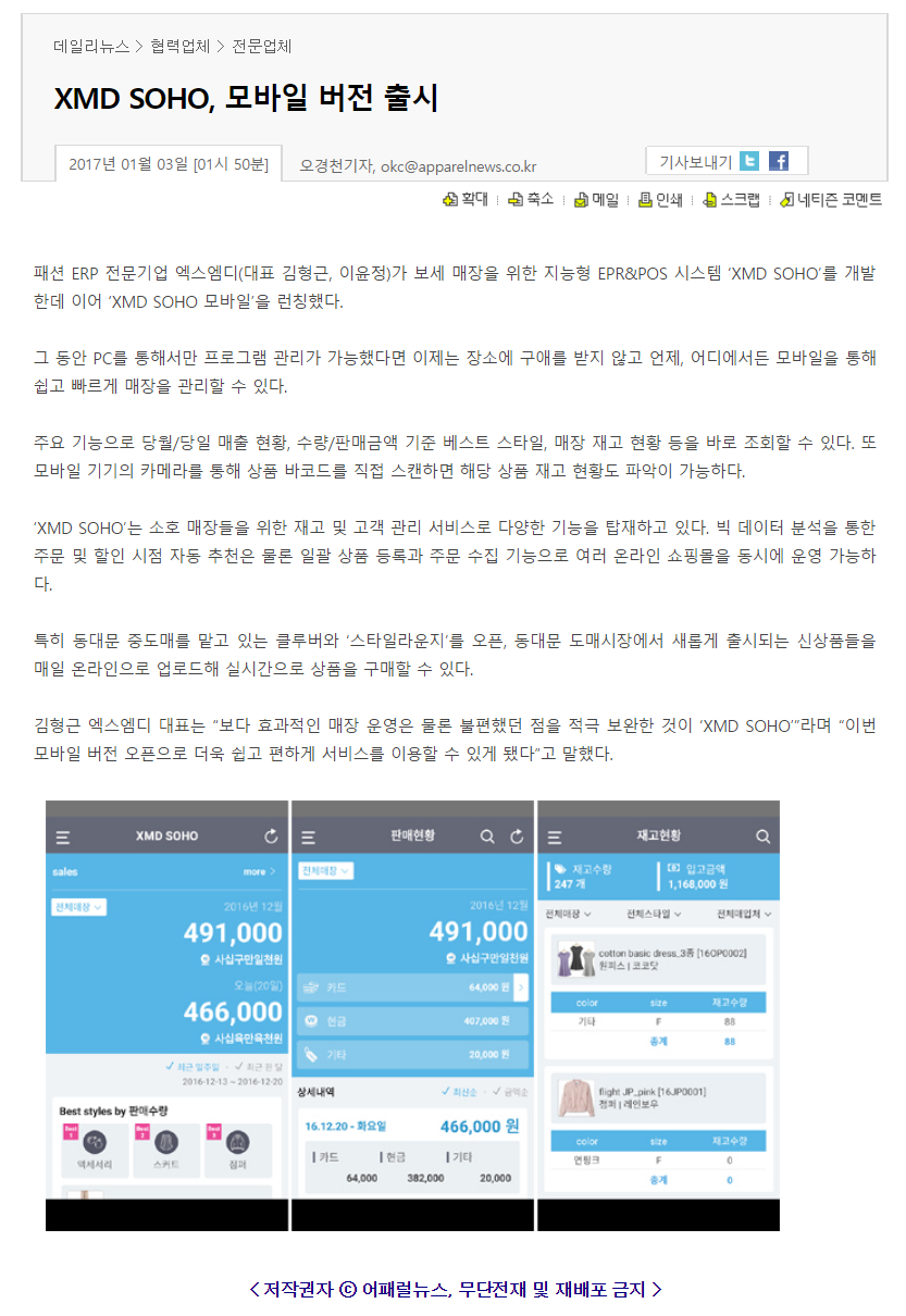 어패럴뉴스 - 엑스엠디 소호 모바일 버전 출시