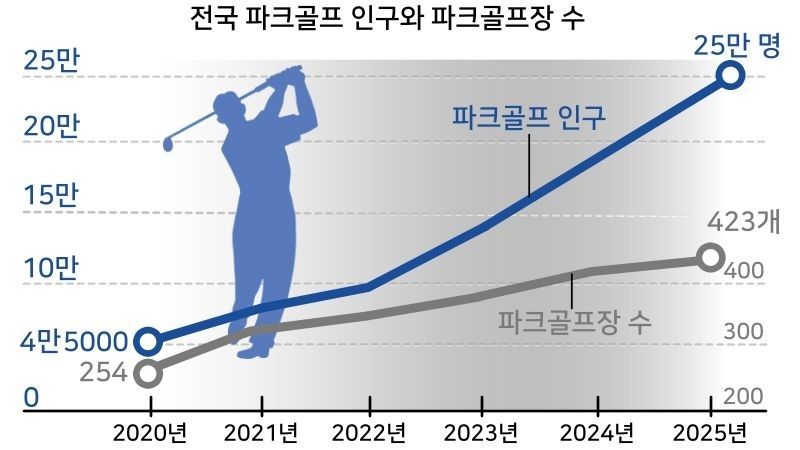 대한파크골프협회에 따르면 2020년 45,478명이었던 등록 회원 수는 2022년 106,505명, 2024년 183,788명으로 4년 사이 4배가 늘어났다. 올해는 25만 명을 넘어섰고, 미등록 회원까지 합하면 40~50만 명에 이르는 것으로 보고 있다.