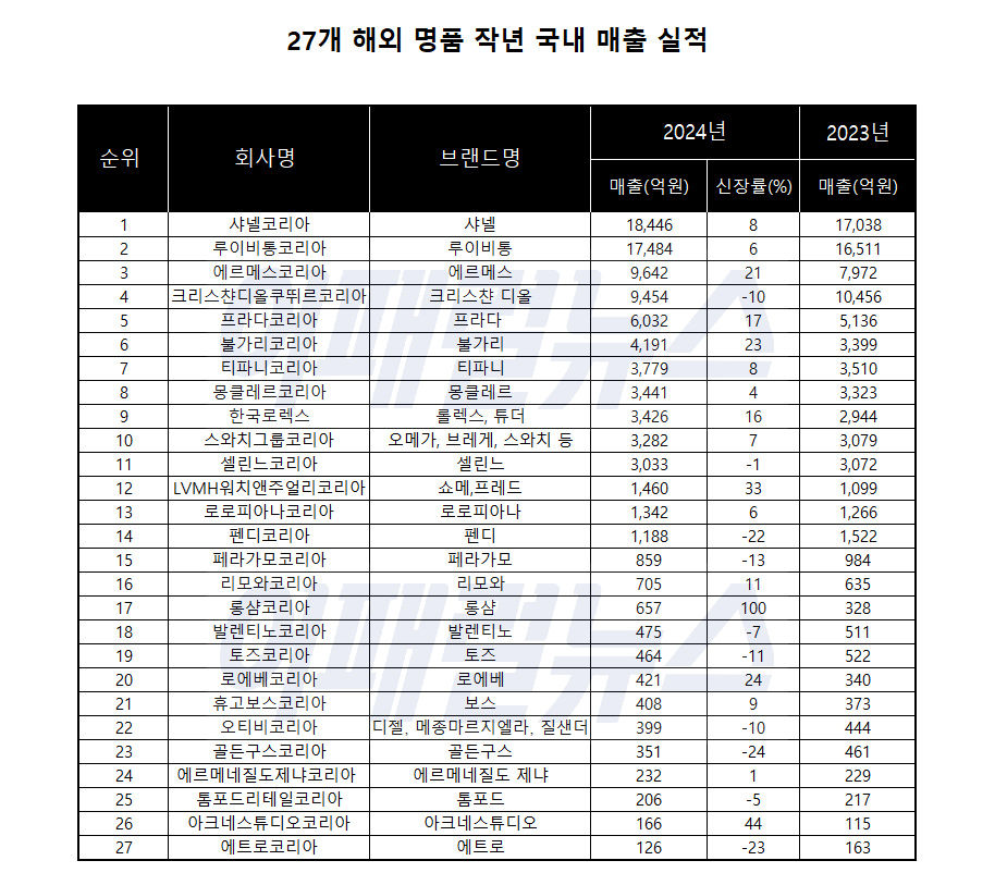 2023년까지만 해도 고전했던 명품 시계, 주얼리가 중위권을 형성한 것도 주목되는 지점이다. 불가리, 티파니, 한국로렉스, 스와치그룹(오메가, 브레게 등), LVHM워치앤주얼리코리아가 6위부터 12위 사이 자리를 잡았다.